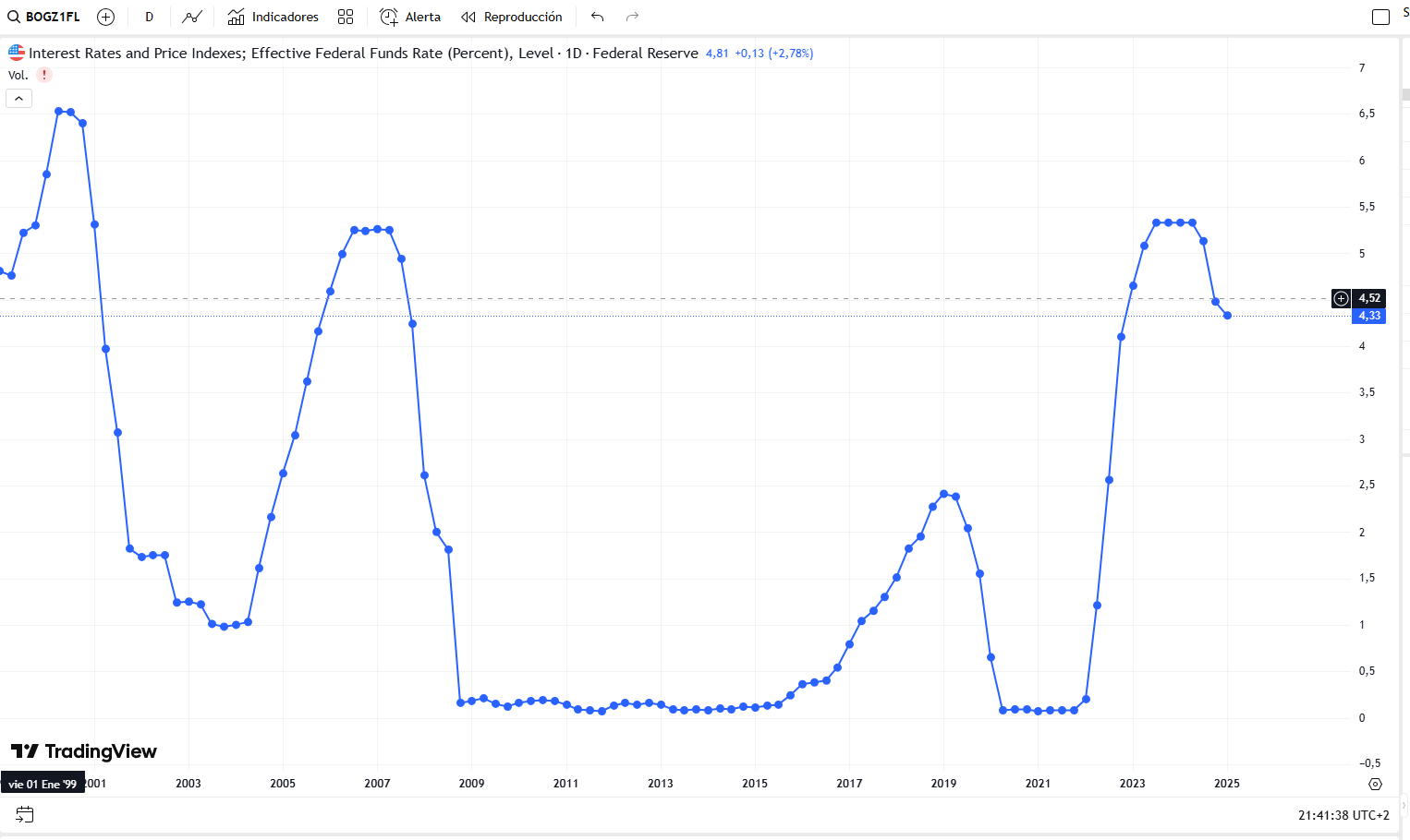 En otras palabras, para que el resto de las altcoins empiecen a coger tracción, el dinero tiene que quemar en las manos. Se necesita crédito barato o prácticamente gratuito, como ocurrió durante los dos ciclos anteriores del mercado cripto (2016 – 2020 y 2020 – 2024) cuando los tipos casi nunca fueron superiores al 2% -solo en 2019, cuando el mercado cripto se hundió-.