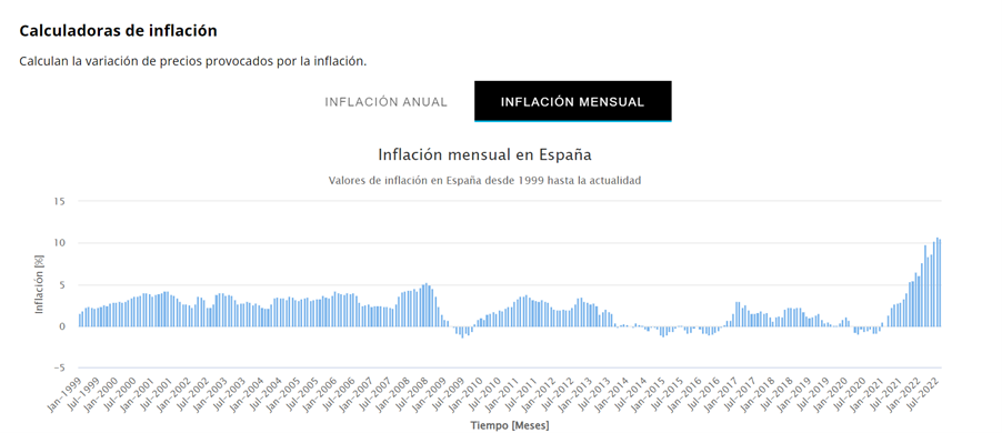 En esta web podrás ver la inflación de España en el momento temporal que gustes de los últimos 20 años.