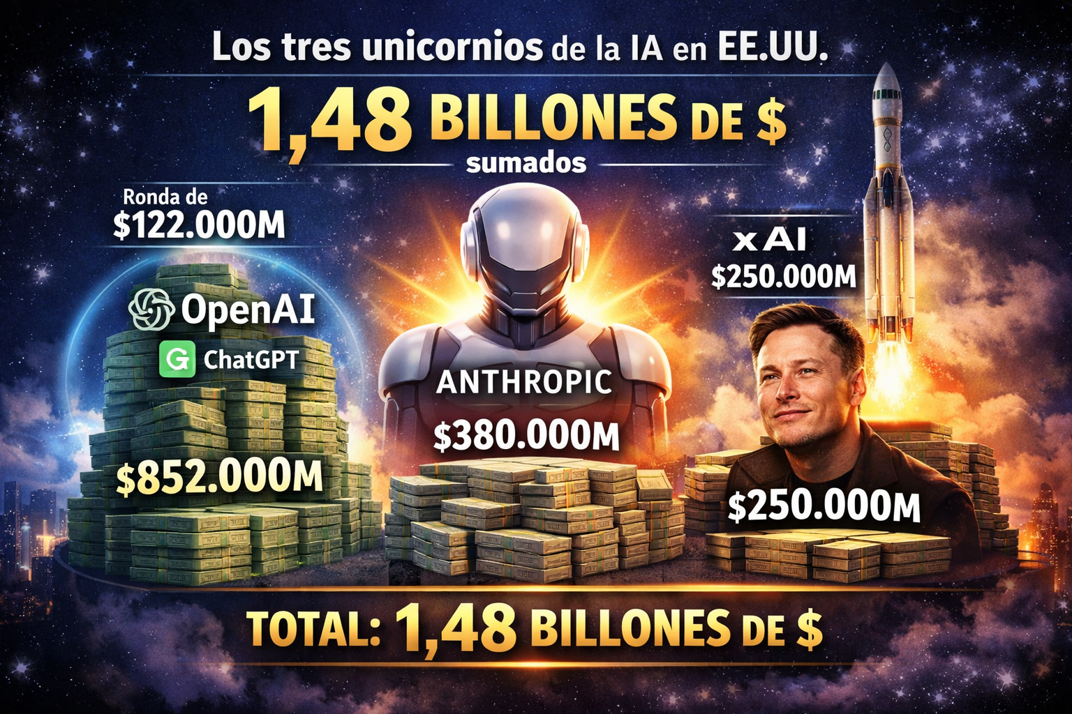 Y mientras Europa celebra la eclosión de sus pequeños unicornios, en Estados Unidos el fenómeno adquiere otra escala. OpenAI, creadora de ChatGPT, cerró hace unos días una ronda de financiación de 122.000 millones USD que eleva su valoración a unos 852.000 millones. Anthropic, responsable del asistente Claude, ronda los 380.000 millones, y xAI (Grok), la apuesta de Elon Musk, se sitúa en 250.000 millones.