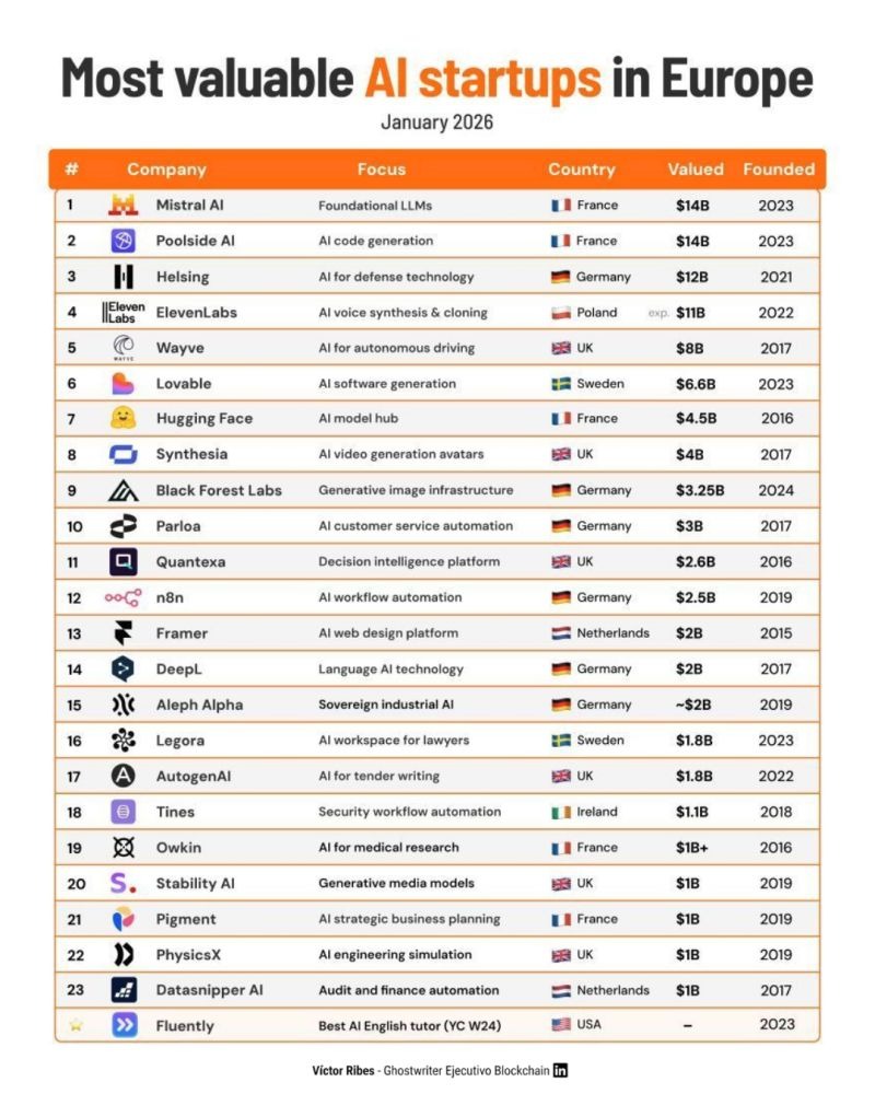 En lo alto del podio continental figuran Mistral AI y Poolside AI, ambas francesas, valoradas en unos 14.000 millones USD cada una. A estas les siguen la alemana Helsing (12.000 M USD), la polaca ElevenLabs (11.000 M USD) y la británica Wayve, especializada en conducción autónoma (8.000 M USD). El ranking incluye también nombres que ya suenan fuera de sus nichos, como es el caso de DeepL, referencia en traducción automática (2.000 M USD).