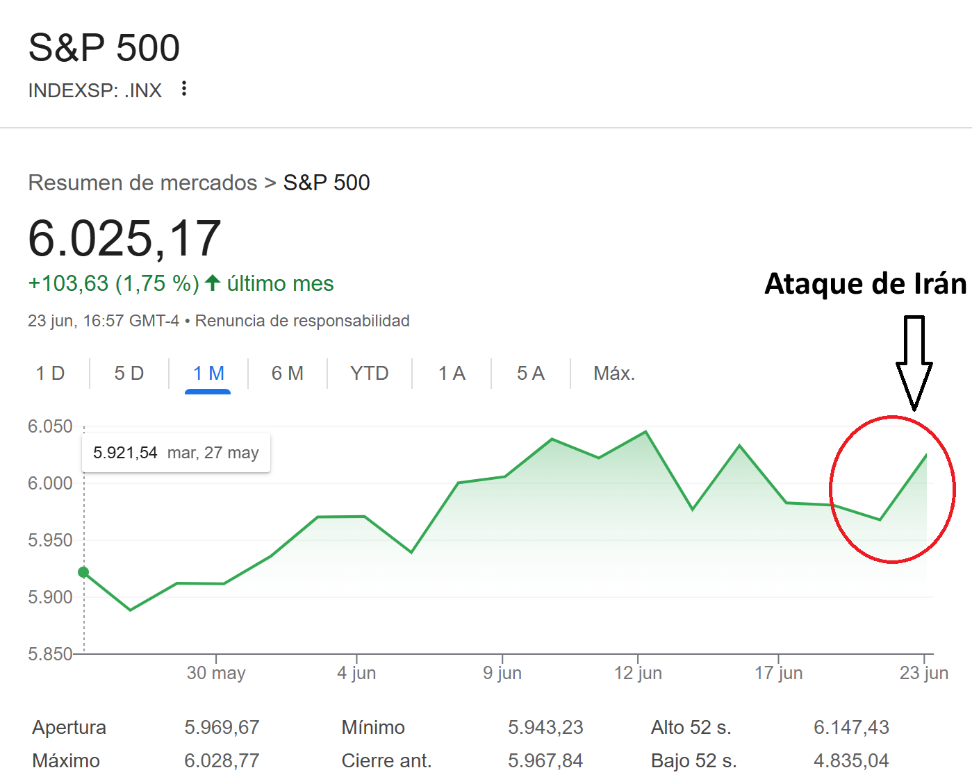 Por una sencilla razón: a la par que que producían los ataques entre ambas potencias, por un lado, el precio del barril de Brent caía casi un 10%, mientras que por otro, otros índices como el SP500 o el Nasdaq subían con fuerza. Es decir, los mercados están descontando por el momento que no se trata más que de un farol; una demostración de fuerza para salvar el ego de ambas potencias, pero que no buscan la escalada -de ahí que ambos ataques se hayan saldado sin víctimas mortales-.