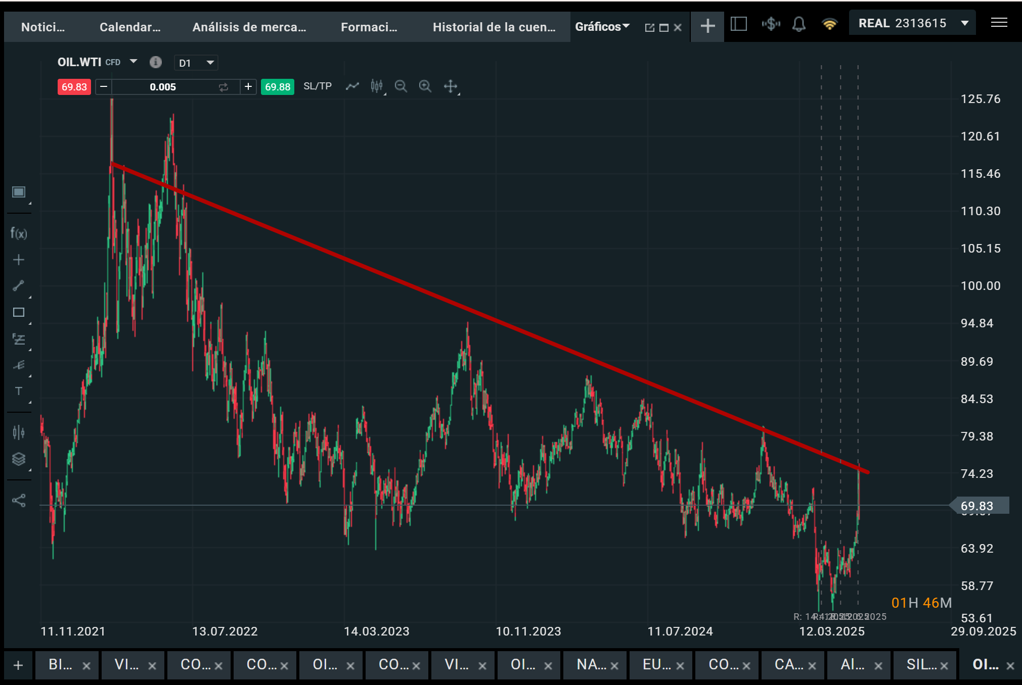 En caso de que se rompiera la resistencia bajista (debido a una mala noticia geopolítica), el precio podría pivotar rápidamente buscando nuevos máximos. Así pues, por el momento queda anulado el efecto por el que Trump -en colaboración con Riad- había conseguido estabilizar en torno a los 50 USD el precio del barril, con la idea de reducir rápidamente los precios de la energía, y por ende, la inflación del dólar. Por lo pronto, las sucesivas rondas de misiles —incluido el primer ataque israelí contra una instalación gasista en South Pars— no han dañado aún grandes terminales de exportación, pero basta la amenaza sobre el Estrecho de Ormuz, por donde transita casi una quinta parte del crudo mundial, para que los fondos vuelvan a apostar al alza.
