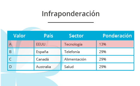 Después de lo explicado anteriormente, deducirás que infraponderar en bolsa equivale a disminuir el peso que un activo tiene en tu cartera.