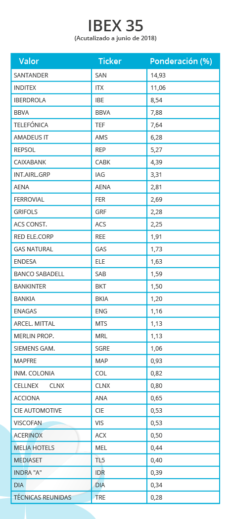 Es decir, dentro del IBEX 35, no tiene el mismo peso, por ejemplo, Inditex (ITX, 11,06%) que Endesa (ELE, 1,63%), como puedes apreciar en la siguiente tabla: