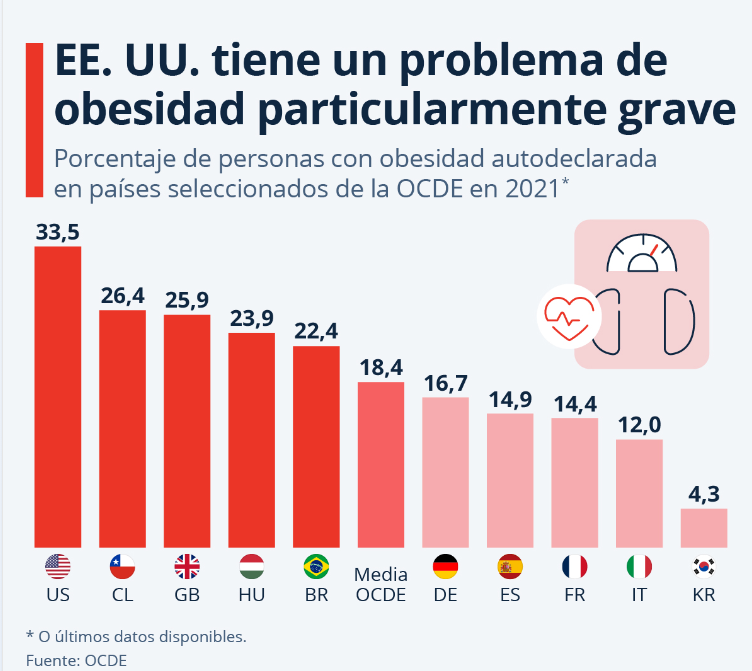 Corea del Sur: presenta el porcentaje más bajo de obesidad entre los países estudiados, con solo un 4,3% de adultos obesos.