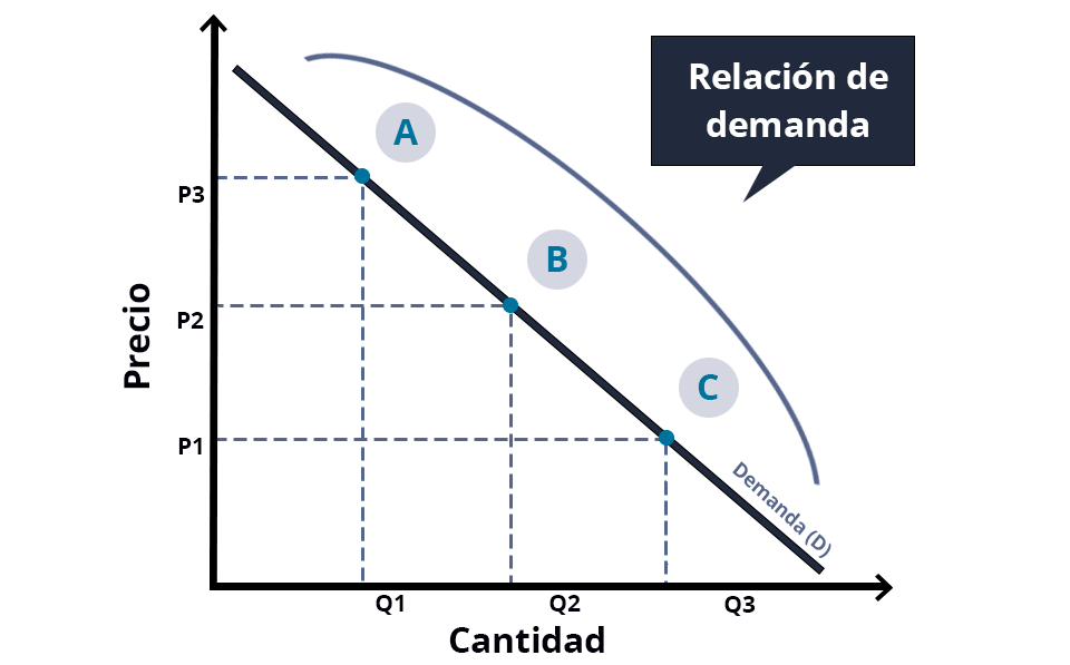 En el pensamiento económico, es importante entender la diferencia entre el fenómeno de la demanda y la cantidad demandada. En el gráfico, el término «demanda» se refiere a la línea azul claro que pasa por A, B y C. Expresa la relación entre la urgencia de los deseos del consumidor y el número de unidades del bien en cuestión. Un cambio en la demanda significa un desplazamiento de la posición o la forma de esta curva; refleja un cambio en el patrón subyacente de los deseos y necesidades del consumidor frente a los medios disponibles para satisfacerlos.