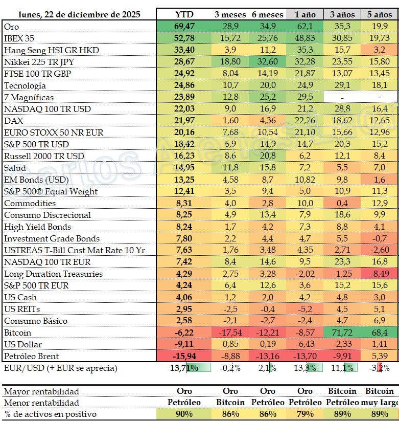 A falta de cerrar el año completo, la foto de mercado deja un mensaje bastante claro. Pese a los constantes malos augurios y los Youtubers vendiendo en fin del mundo, 2025 ha sido un año mayoritariamente positivo para la mayoría de activos, tanto es así que el 90% han acabado el año en verde. Vamos a hacer un repaso para conocer cuáles han sido las mejores y las peores inversiones del saliente 2025 (medido en dólares).