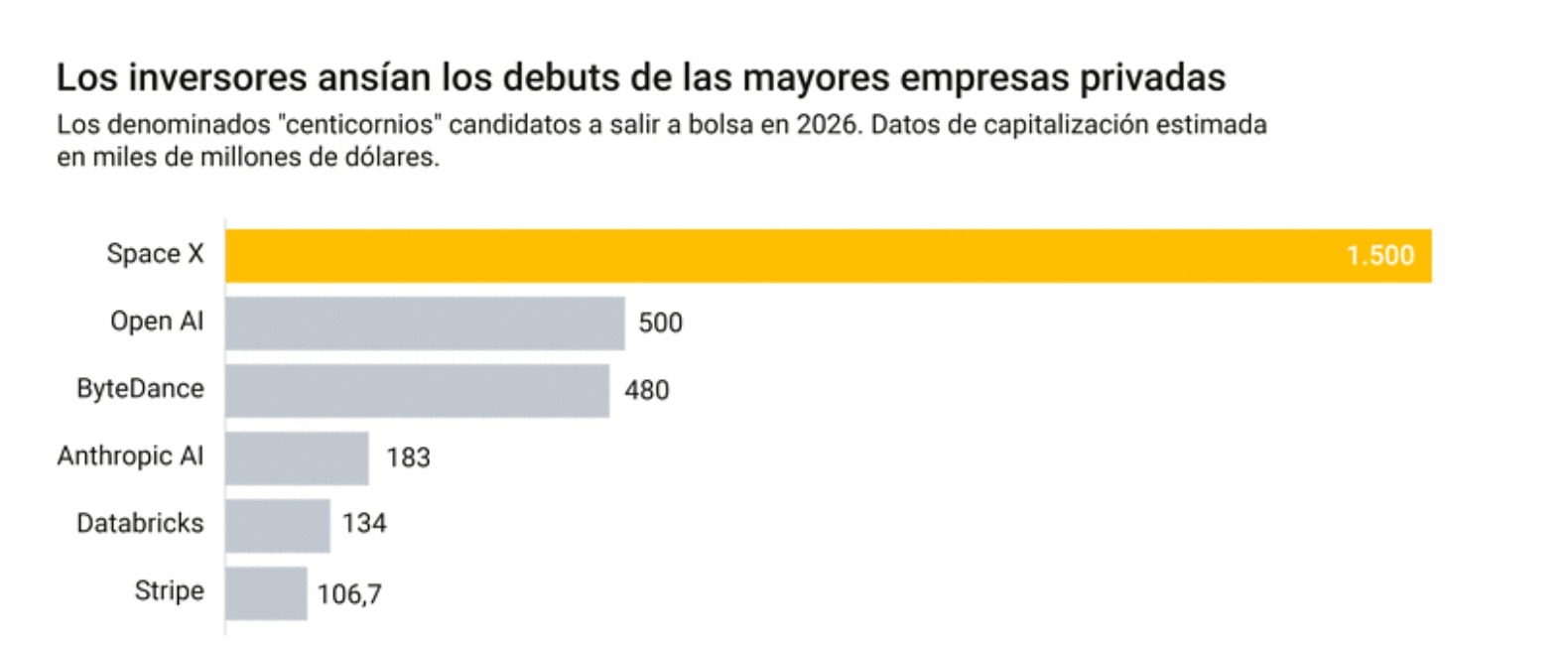 - En el caso de OpenAI, varias informaciones apuntan a que está explorando pasos preliminares para una salida a bolsa a partir del 2º semestre de 2026. Y la tesis es bastante clara, recaudar hasta 60.000 millones de dólares (e incluso más), para en poco tiempo llevar la cotización de la compañía a 1 billón de dólares, con la idea de obtener recursos para financiar la infraestructura, y seguir liderando la carrera de la IA.
