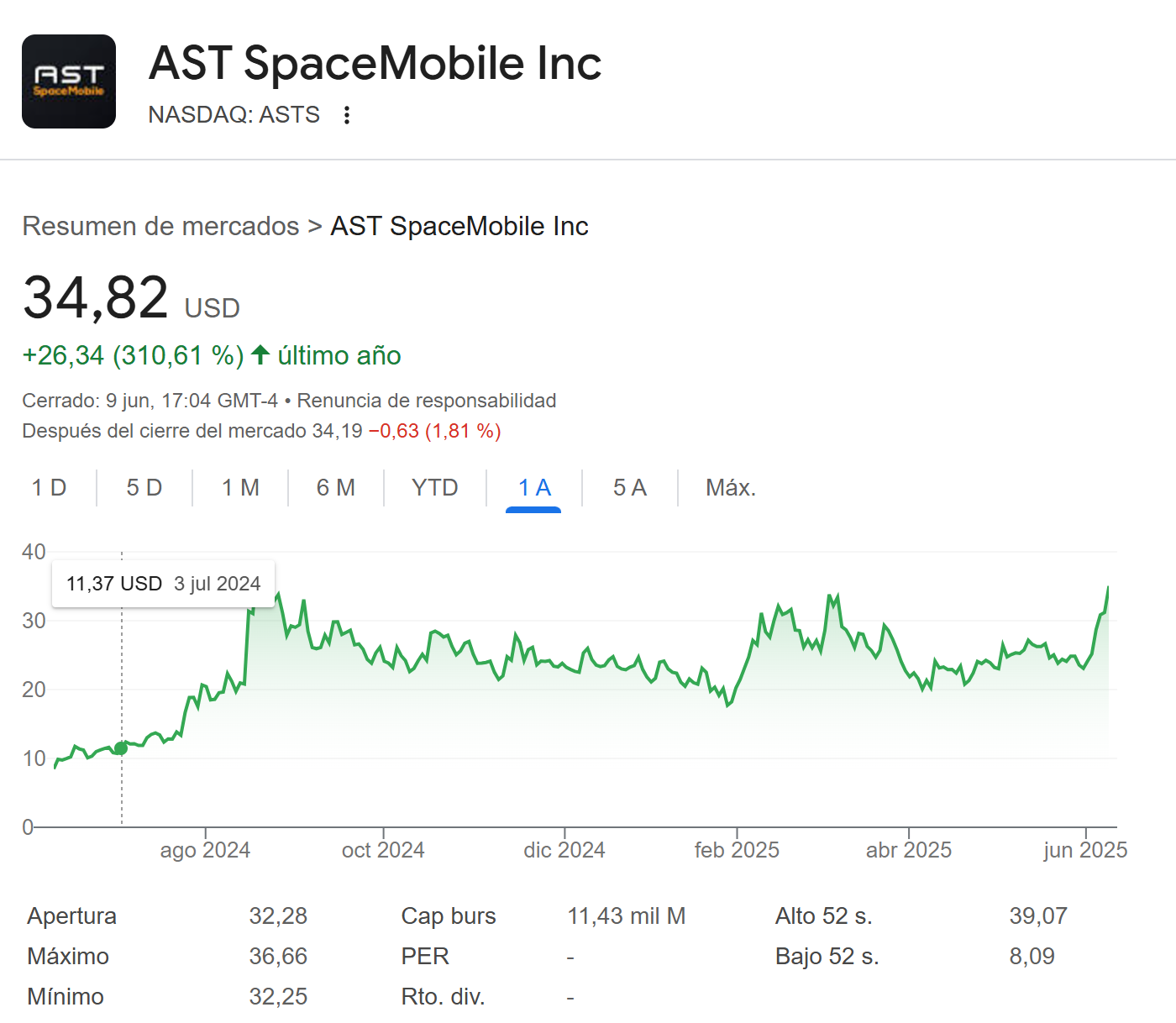 Lo más curioso de todo es que el gran ganador de toda esta trifulca parece haber sido la startup AST SpaceMobile (ASTS), una especie de competidor de menor alcance -por el momento- del sistema Starlink de SpaceX, que en las cinco últimas sesiones se ha disparado más de 40% para alcanzar nuevos máximos históricos.